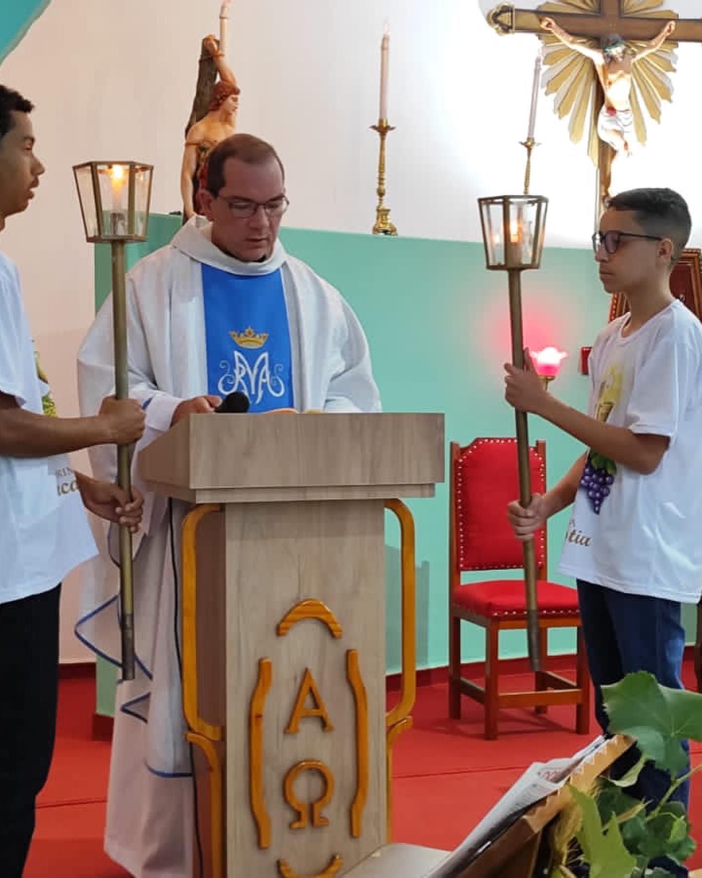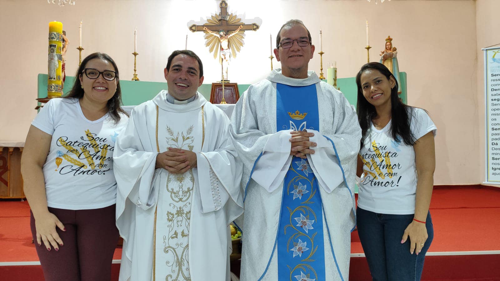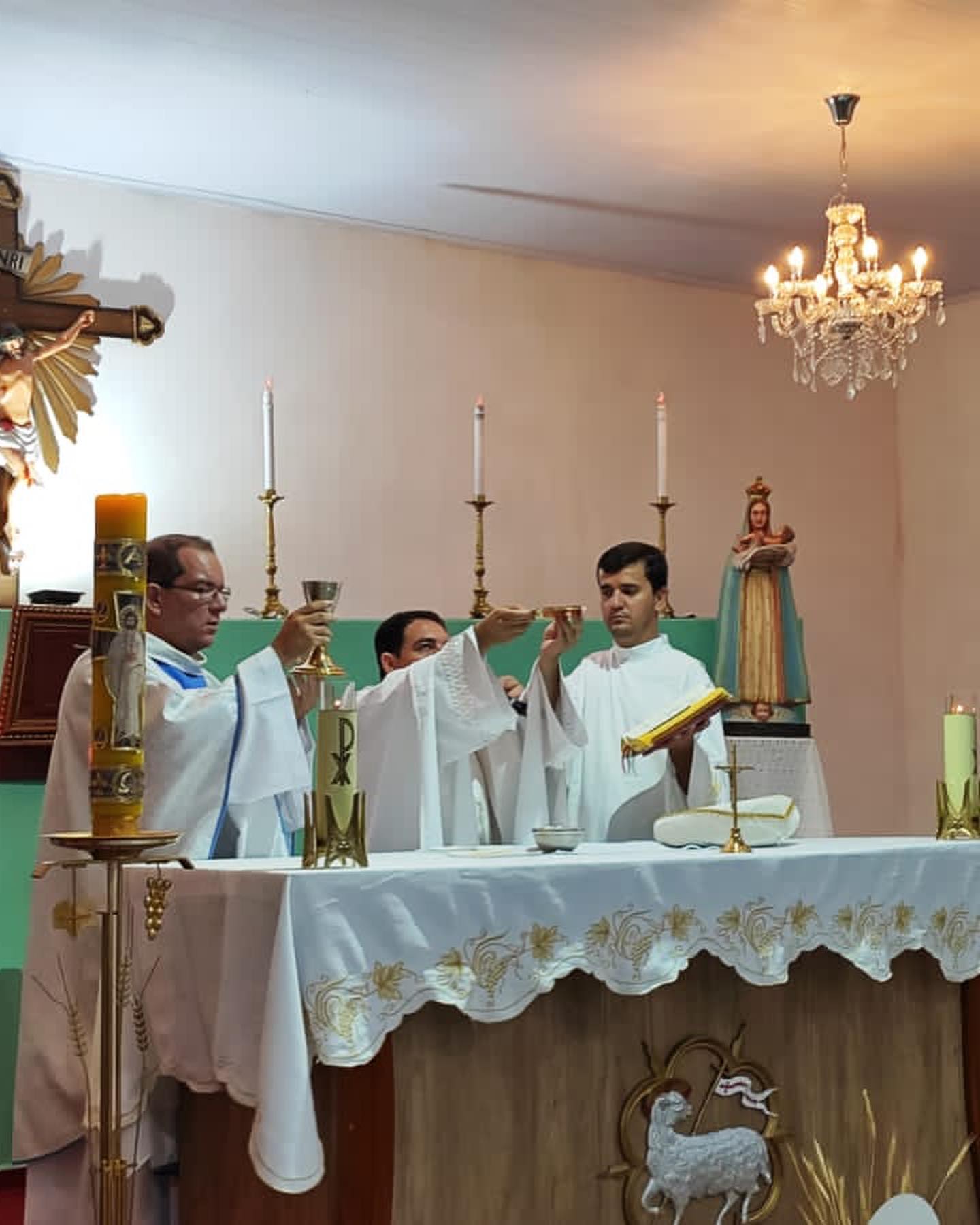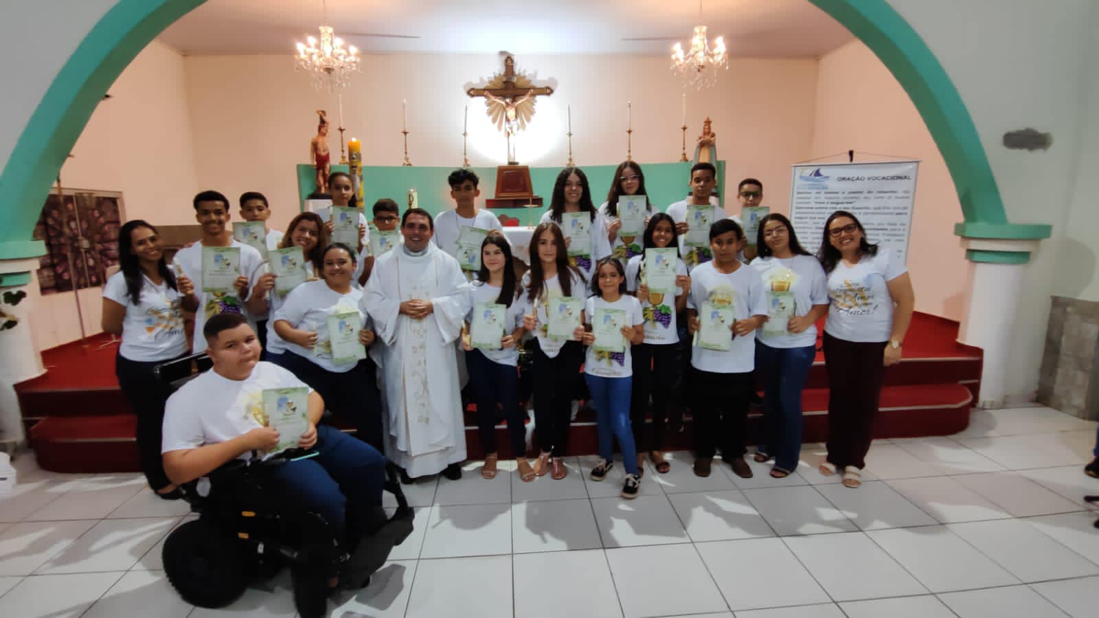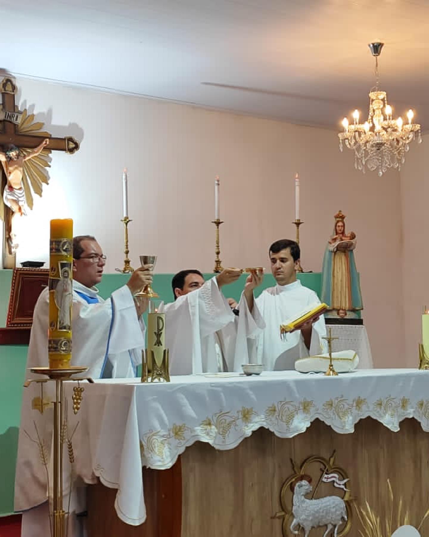 Aconteceu neste sábado 06 de maio de 2023 na Paroquia Nossa Senhora da Abadia, em Ribeiraozinho MT – Forania Sul – Diocese de Barra do Garças MT. A Santa Missa, onde foi conferida o Sacramento da Sagrada Comunhão, aos adolescentes da Paroquia. Presidiu a Santa Missa, o Pe. Diego Bento. Filho Natural de Ribeiraozinho MT. Que no momento atua na cidade da Chapada dos Guimaraes, Diocese de Primavera do Leste MT. Concelebrou a Santa Missa o Pe. Douglas Aires, Administrador Paroquial da Paroquia Nossa Senhora Aparecida, em Pontal do Araguaia MT. O Pe. Douglas, é o responsável pelo SAV – Serviço de Animação Vocacional da Diocese, que trouxe o Seminarista Alex, que irá fazer seu estagio pastoral, ajudando nos trabalhos Pastorais da Paroquia em Ribeiraozinho MT.